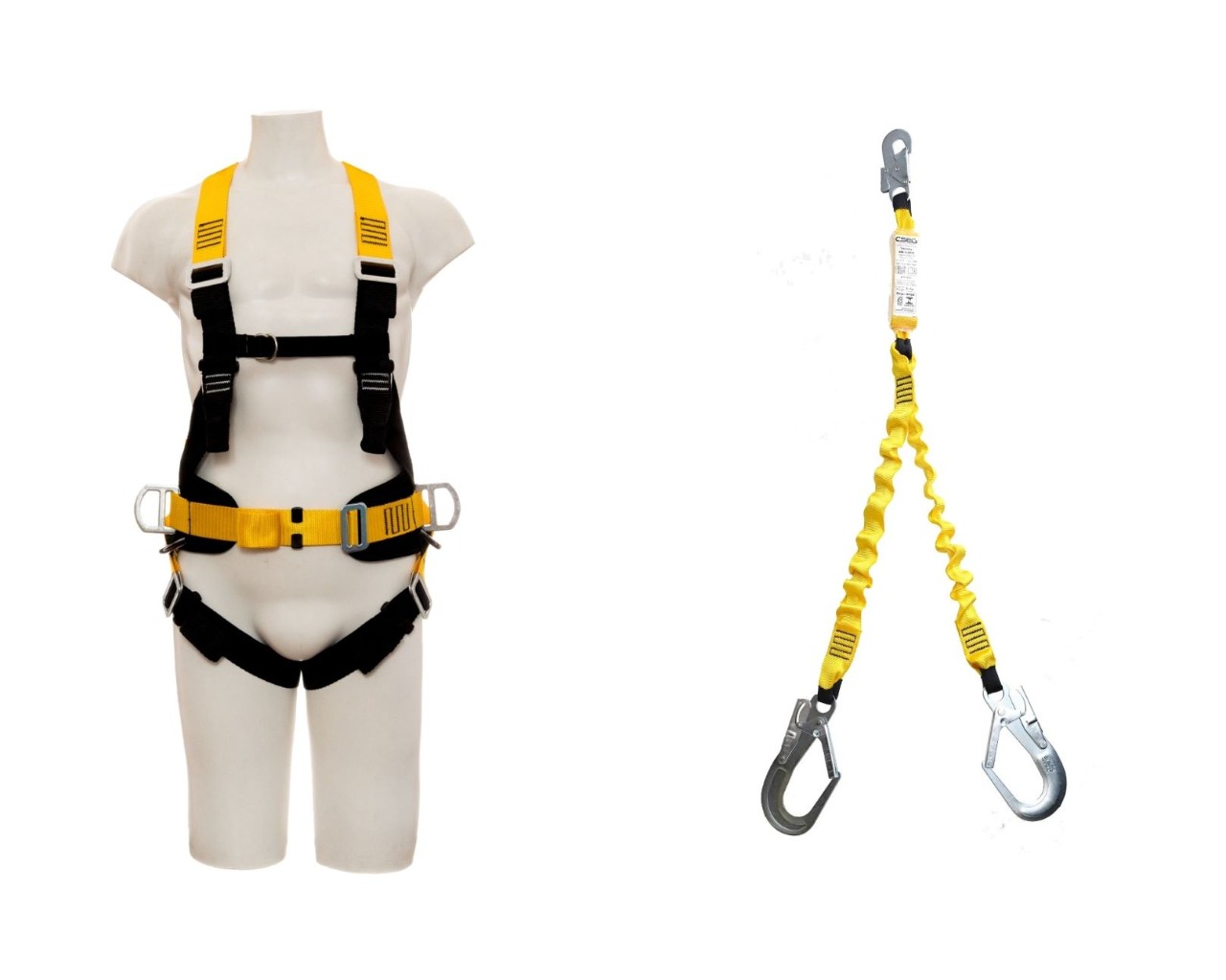 Fitas primárias e secundárias confeccionadas a partir de Poliéster de Alta tenacidade multifilamentos e com resistência à ruptura superior a 0,6 N/tex. Componentes metálicos em aço carbono de alta resistência, regulador em plástico PVC e linhas 100% poliéster de alta resistência.Trava quedas deslizante para retenção em queda para deslocamentos verticais. Extensor em fitas Poliester de Alta tenacidade multifilamentos e com resistência à ruptura superior a 0,6 N/tex. Componentes metálicos em aço carbono de alta resistência.