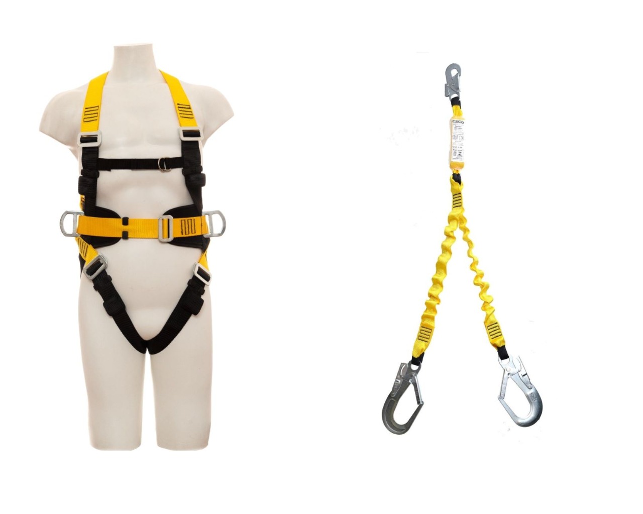 Fitas primárias e secundárias confeccionadas a partir de Poliéster de Alta tenacidade multifilamentos e com resistência à ruptura superior a 0,6 N/tex. Componentes metálicos em aço carbono de alta resistência, regulador em plástico PVC e linhas 100% poliéster de alta resistência.Trava quedas deslizante para retenção em queda para deslocamentos verticais. Extensor em fitas Poliester de Alta tenacidade multifilamentos e com resistência à ruptura superior a 0,6 N/tex. Componentes metálicos em aço carbono de alta resistência.