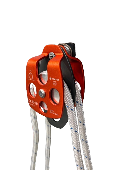 Polia dupla grande articulada em aluminio acabamento anodizado para corda de diametro até 16mm; resistência 30kn; peso 423g.